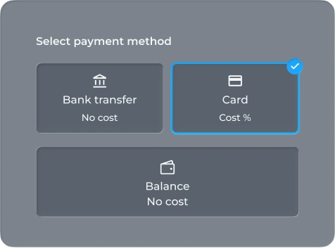 Pick between card, bank, or balance. Transfers are completed in seconds.